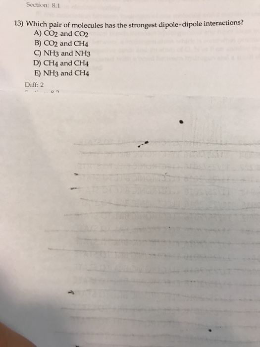 Which pair of molecules has the strongest dipole-dipole interactions. 119 Which pair of molecules has the strongest dipole - dipole interactions. What pair of molecules has the strongest dipole - dipole interactions co2-co2 or co2-ch4 or nh3-nh3 or nh3-ch4 or ch4-ch4.